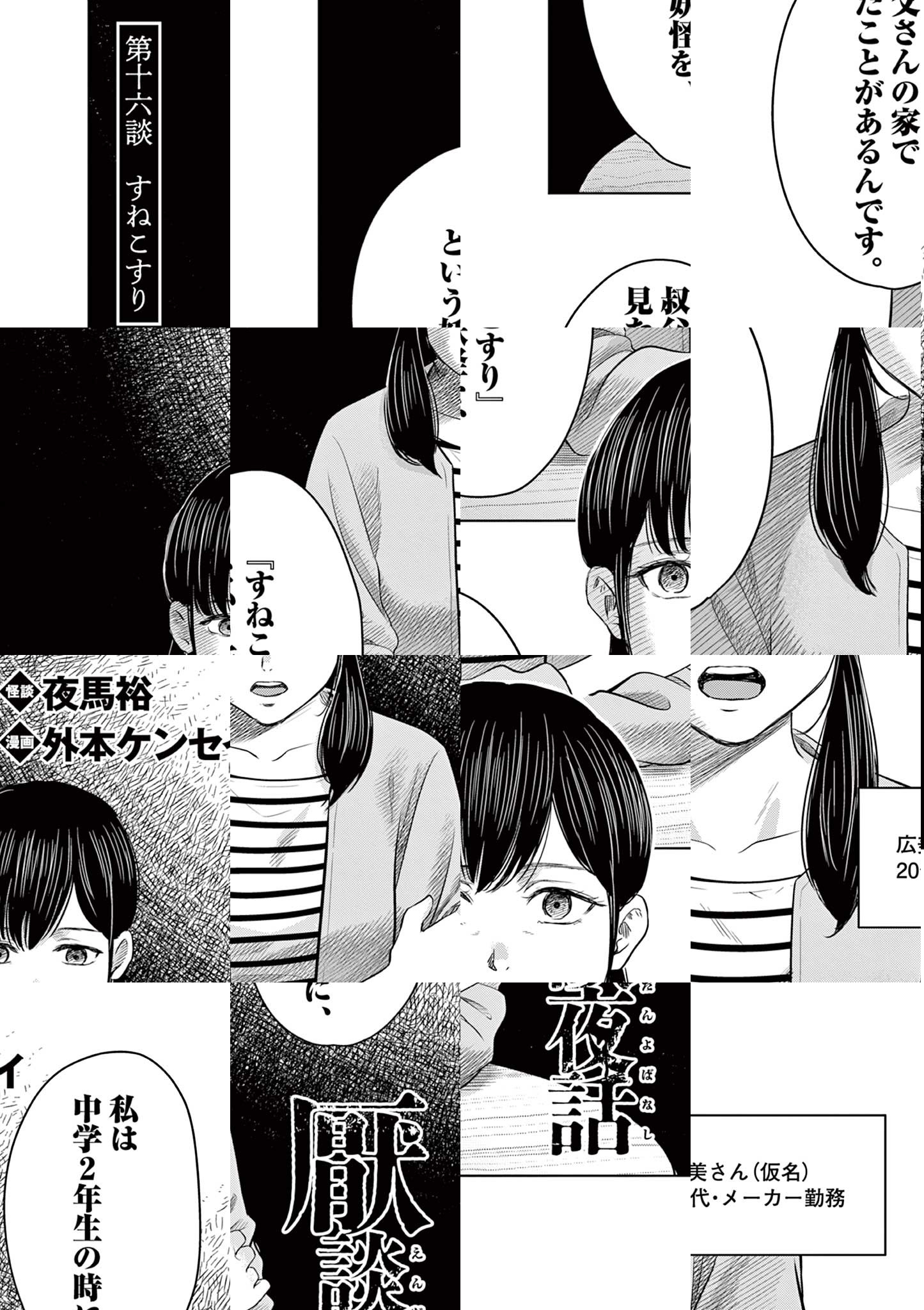 実話怪談師・夜馬裕と鬼才・外本ケンセイが贈る戦慄のホラーオムニバスが開幕―――20年以上にも渡って全国から収集された実話怪談を、人間のリアルと狂気に深く切り込む外本ケンセイが完全漫画化。厭(いや)な怪談の世界にあなたを誘う。 この世のどこかにある一室で、可愛らしい少女が語り始めたのは・・・?