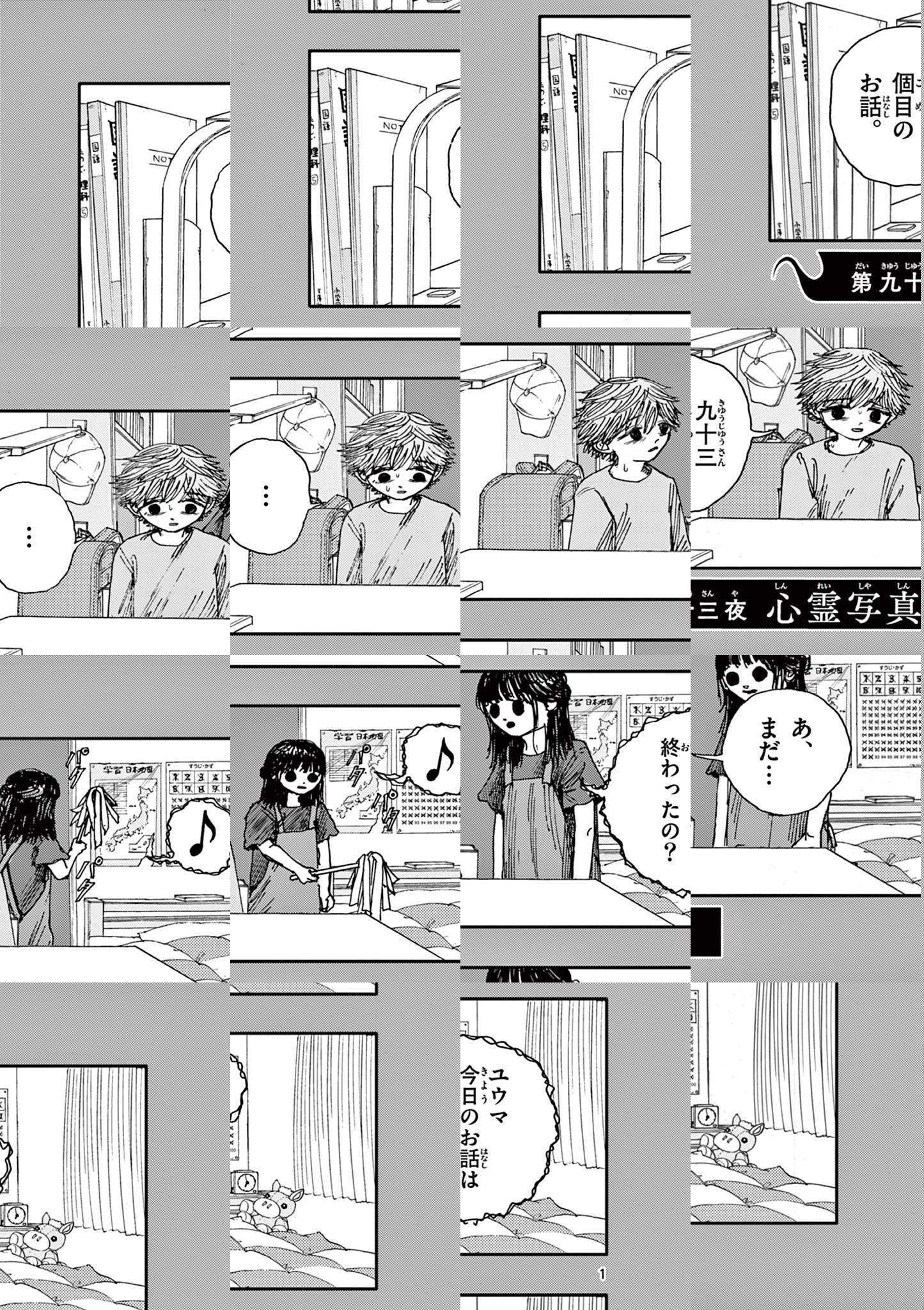 ある日、ユウマくんは、百物語を始める。 ※【百物語】とは・・・ 日本の伝統的な怪談会のスタイルのひとつ。100話の怪談を語り終えると、本物の「物の怪」が現れるとされる。 起源は不明だが、主君に近侍して話し相手を務めた中世の御伽衆に由来するとも、武家の肝試しに始まったとも言われている。