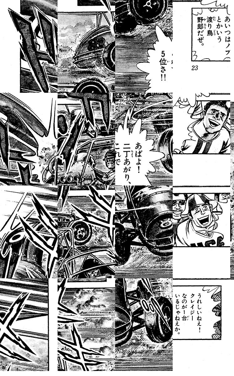 レースをもとめ全米を旅から旅へ、賞金かせぎのレースドライバー。ふまれてもけられても、爆音の中から立ちあがるドロまみれの戦士、その名は、ノブ・トクガワ!!1979年、週刊少年サンデー連載作品。