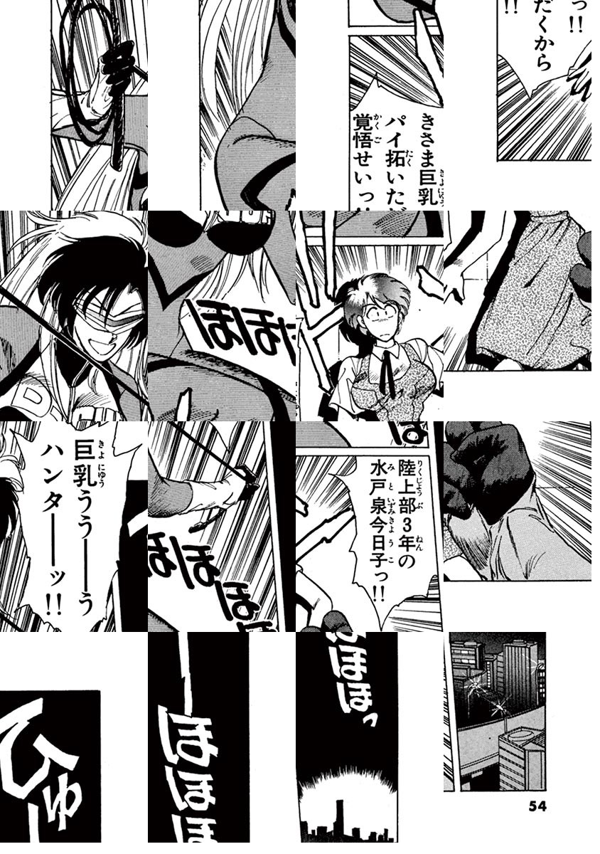 高校生の恭塚まさ子は容姿端麗、成績優秀、スポーツ万能。 だが好きな男子に告白したら、「貧乳である」の一点だけでふられてしまう。 まさ子は巨乳の女性に対して逆恨みし、あやしげなコスチュームと顔を隠すゴーグルを自作。 巨乳の女子達の魚拓ならぬパイ拓をとるため、胸に肉まんを詰めて「D-cup」と書かれたコスチュームを着用し、巨乳ハンターと名乗る。