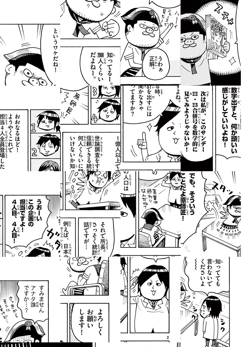 「先生は、漫画を描くときどんなご飯を食べるの?」、「どんなお仕事場なの?」などなど、読めばキミも明日からサンデー通になれる、少年サンデーの裏側(ヒミツ)を非科学的にレポート!!漫画家さんに直撃する回はファン必見です!! 【WEB持ち込み受付開始!】 少年サンデーは2020年4月より、 WEB上での漫画作品持ち込みの受付を開始しました! 投稿方法は超簡単!! まずはこのURLにアクセス!! ↓ https://www.sunday-webry.com/event/www_webbosyu/ ※この漫画は、2016年4月~2017年10月まで週刊少年サンデーに連載していた巻末漫画です。掲載されている情報は、雑誌発売当時の内容ですので予めご了承くださいませ。懸賞やアニメの放送などは終了しておりますので、ご注意ください。 ◆作者コメント 漫画家には変人が多いので、漫画好きだけじゃなくて変人好きにもおすすめです!いろんな話聞かせてもらったなぁ。