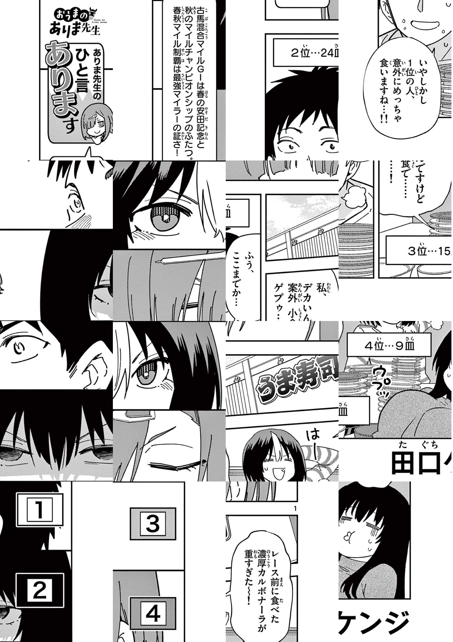 同じ職場の先輩保育士・ありま先生。 頼りになるし、尊敬できるところもあって、正直気になっているっていうか好き……なんですけど。 めちゃくちゃ競馬好きなんですよね。 週末はレースがあるし、夜もナイター競馬? とかに行ってるみたいで。 デートの誘いも上手くいかないし、関係も進展しない……いや、そもそも眼中にないかも。 いやほんと、片思いって大変ですね。 競馬大好きありま先生がはるあき先生に心惹かれる日は来るのか!? 恋のライバルはまさかの競走馬!? 姉まんがの旗手・田口ケンジが贈る競馬ラブコメディー!