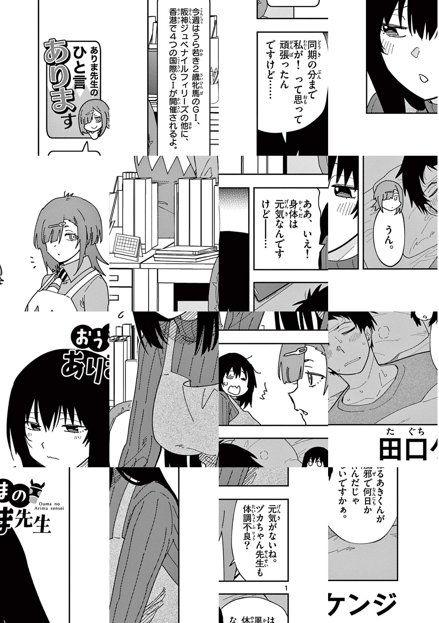 同じ職場の先輩保育士・ありま先生。 頼りになるし、尊敬できるところもあって、正直気になっているっていうか好き……なんですけど。 めちゃくちゃ競馬好きなんですよね。 週末はレースがあるし、夜もナイター競馬? とかに行ってるみたいで。 デートの誘いも上手くいかないし、関係も進展しない……いや、そもそも眼中にないかも。 いやほんと、片思いって大変ですね。 競馬大好きありま先生がはるあき先生に心惹かれる日は来るのか!? 恋のライバルはまさかの競走馬!? 姉まんがの旗手・田口ケンジが贈る競馬ラブコメディー!