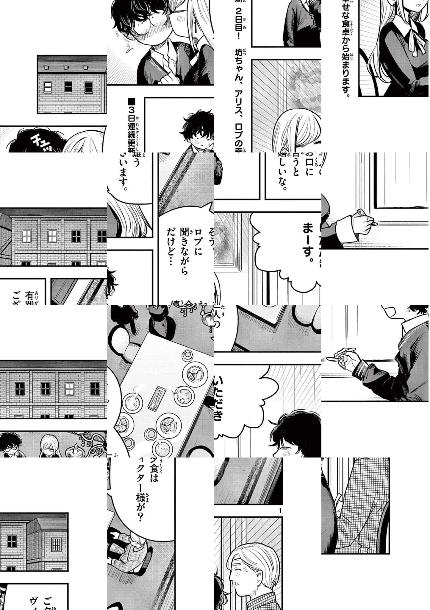 町から外れた森の中、その奥の奥にひっそり佇む大きなお屋敷。そこには「死神」が住んでいる__ある日、魔女に「触れたもの全てを死なせてしまう」呪いをかけられ、周囲に拒絶されるようになった貴族の「坊ちゃん」。そんな坊ちゃんが今一番困っていることは…彼に仕えるメイド・「アリス」の逆セクハラ!彼女のことが気になる坊ちゃん。逆セクハラは嬉しい…でも触れられないのは辛い!アリスもどうやら坊ちゃんが気になっているようだけど、坊ちゃんは彼女の手さえも繋げない。二人の純愛は実を結ぶのか!? Twitterで大反響を呼んだ、二人の小さな恋物語、待望の週刊連載化!! ◆作者コメント ちょいギャグちょいエロちょい純愛で頑張っていこうと思います。 ◆作者コメント(最終話まで読んでいただいた方へ) ご愛読有難うございました。 死神坊ちゃんと黒メイドに関連するお話を思いついたらまたなにか描きますので、見に来て頂けると嬉しいです。