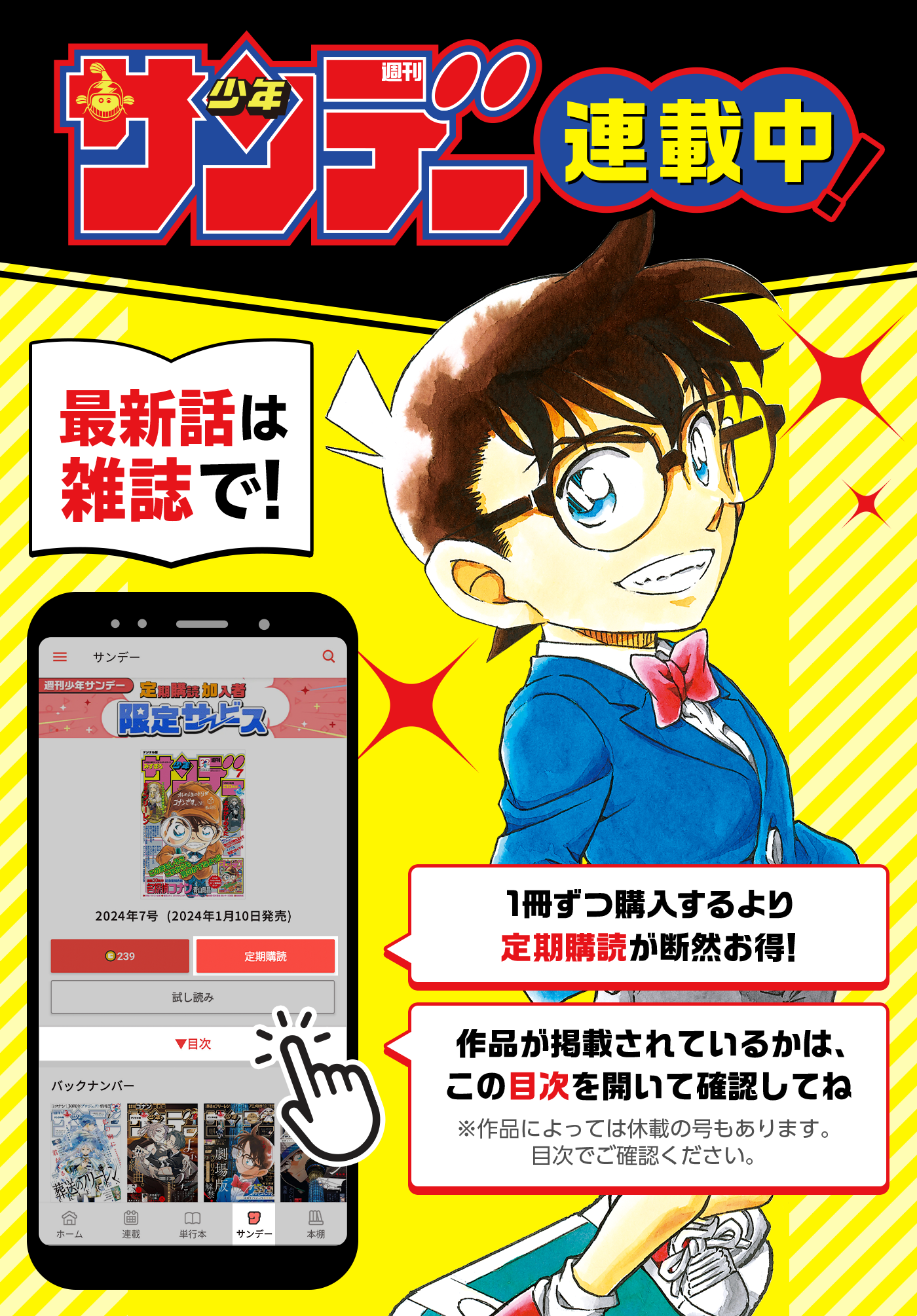ホームズばりの推理力で、大活躍の高校生名探偵・工藤新一。ところがある日、事件を追っていた彼は、妙な薬の力で、なんと子供に戻ってしまった…!?仮の名を“江戸川コナン”。アニメ・映画も大人気の原作まんが!
