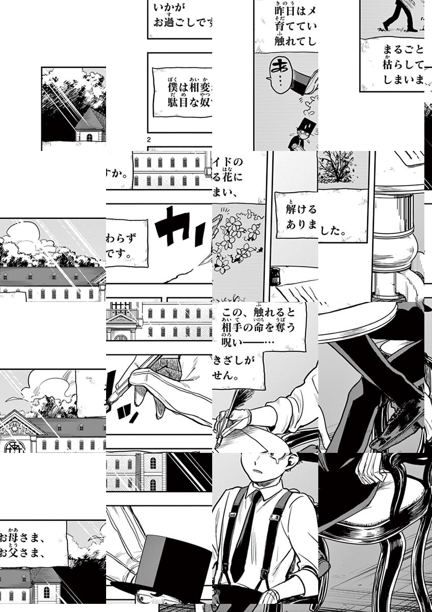 町から外れた森の中、その奥の奥にひっそり佇む大きなお屋敷。そこには「死神」が住んでいる__ある日、魔女に「触れたもの全てを死なせてしまう」呪いをかけられ、周囲に拒絶されるようになった貴族の「坊ちゃん」。そんな坊ちゃんが今一番困っていることは…彼に仕えるメイド・「アリス」の逆セクハラ!彼女のことが気になる坊ちゃん。逆セクハラは嬉しい…でも触れられないのは辛い!アリスもどうやら坊ちゃんが気になっているようだけど、坊ちゃんは彼女の手さえも繋げない。二人の純愛は実を結ぶのか!? Twitterで大反響を呼んだ、二人の小さな恋物語、待望の週刊連載化!! ◆作者コメント ちょいギャグちょいエロちょい純愛で頑張っていこうと思います。 ◆作者コメント(最終話まで読んでいただいた方へ) ご愛読有難うございました。 死神坊ちゃんと黒メイドに関連するお話を思いついたらまたなにか描きますので、見に来て頂けると嬉しいです。