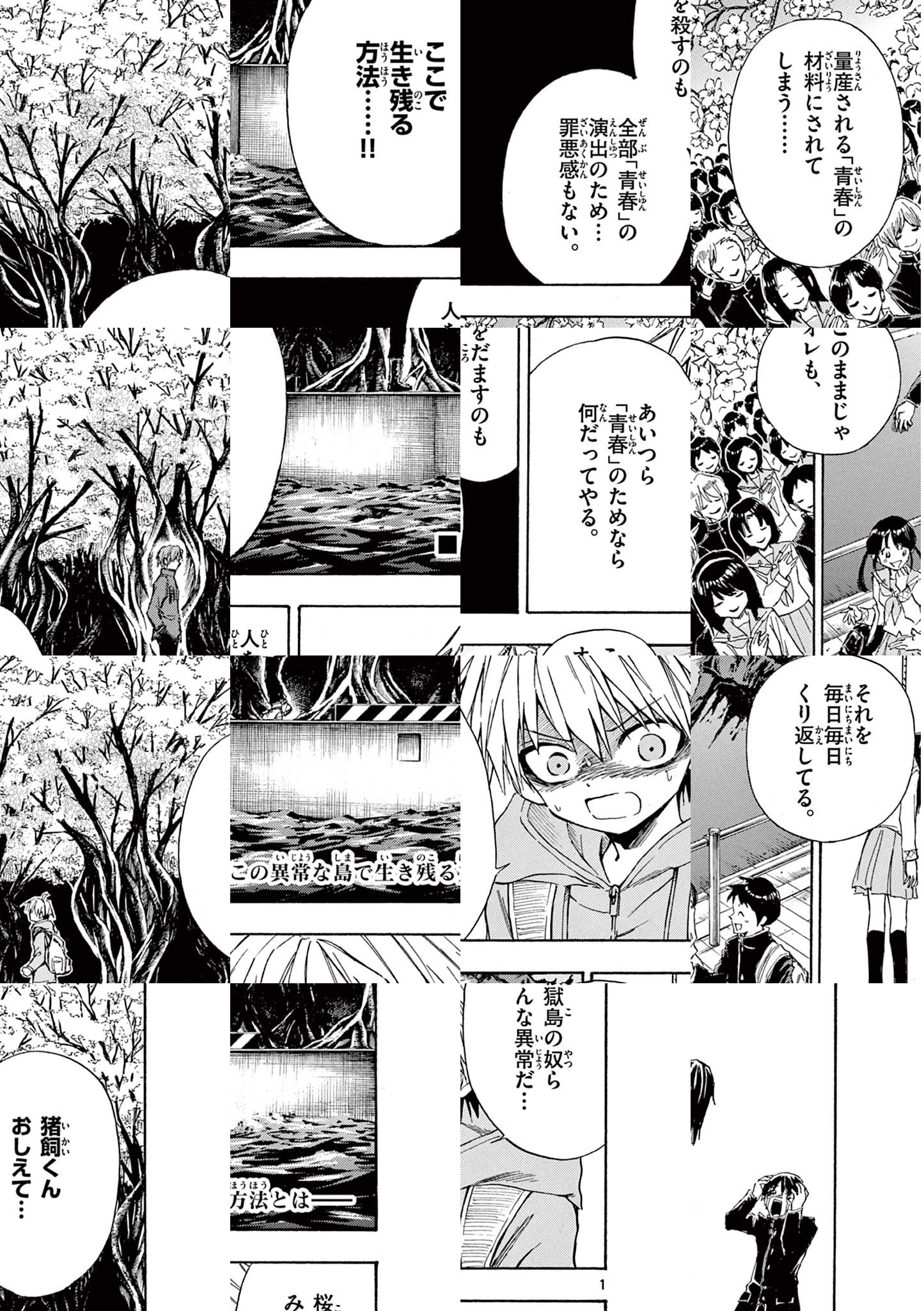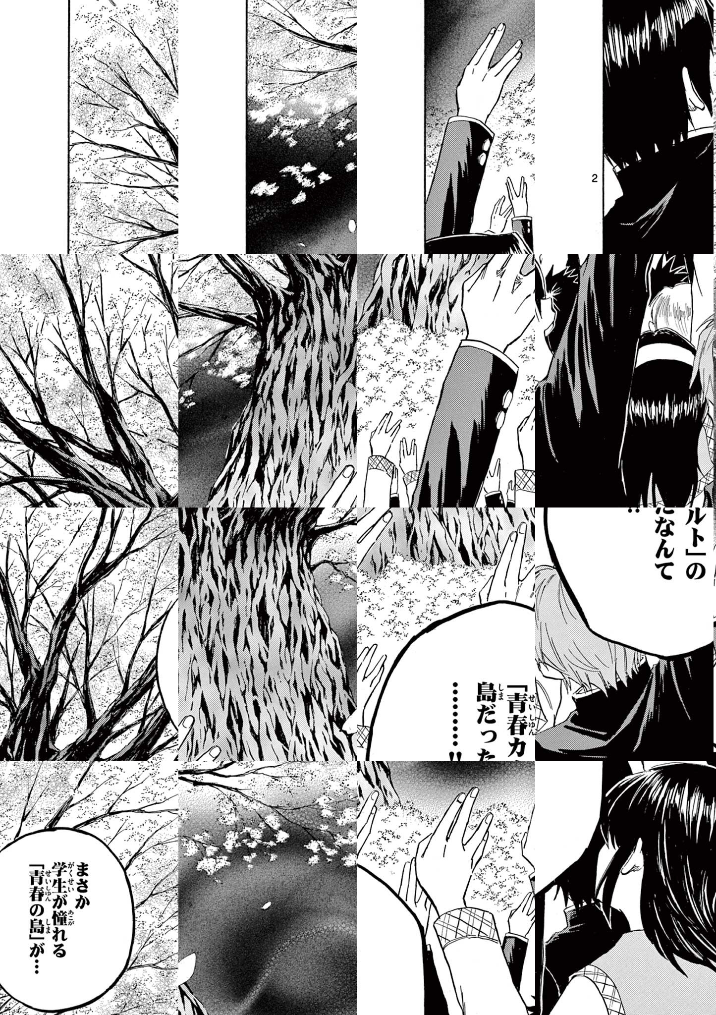 桜獄島__ 大人も学生もみんな幸せそうに楽しく暮らす、まるで天国のような島。この島で暮らせば、きっと青春いっぱいの充実した学園生活がおくれるだろう。 だが、それは表向きの姿で…… この島の正体は、あるカルト宗教が支配している信者だらけの狂気の島。住民全員が信仰しているのは…「青春」!? 最も青春を謳歌した人生をおくれたものが、最も神に近づける。だから島民たちは、今日も自分が物語の主人公であるかのように振る舞う… この島の真実に気づいてしまった転校生・無木秋一は、次々と起こる狂気の「青春ストーリー」をかわし、このカルト信者たちの島から脱出することができるのか!?